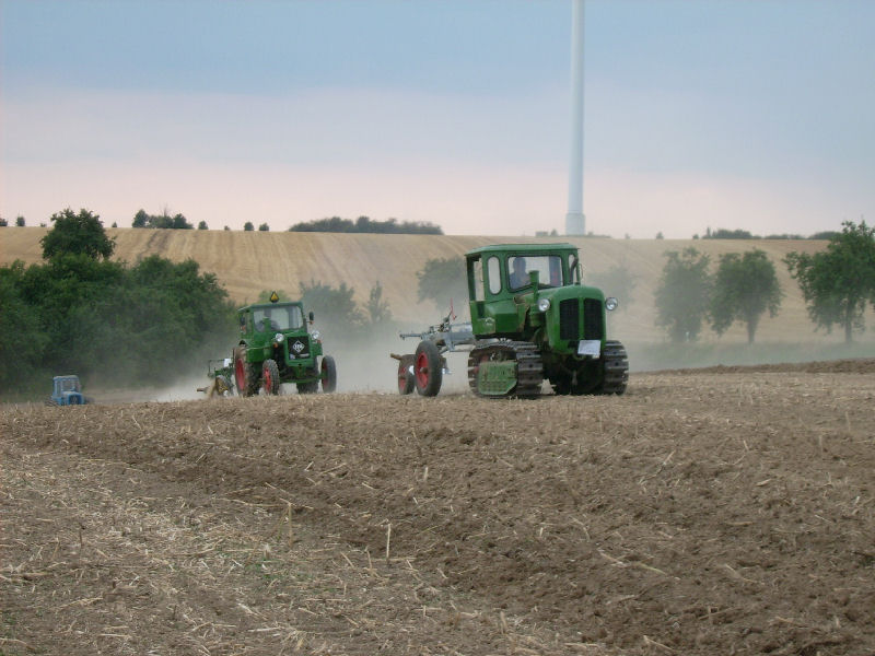 Die KS07 und der Pionier kommen neben der Ackerfläche zurück um die nächste Furche zu ziehen beim Rottelsdorfer Schleppertreffen