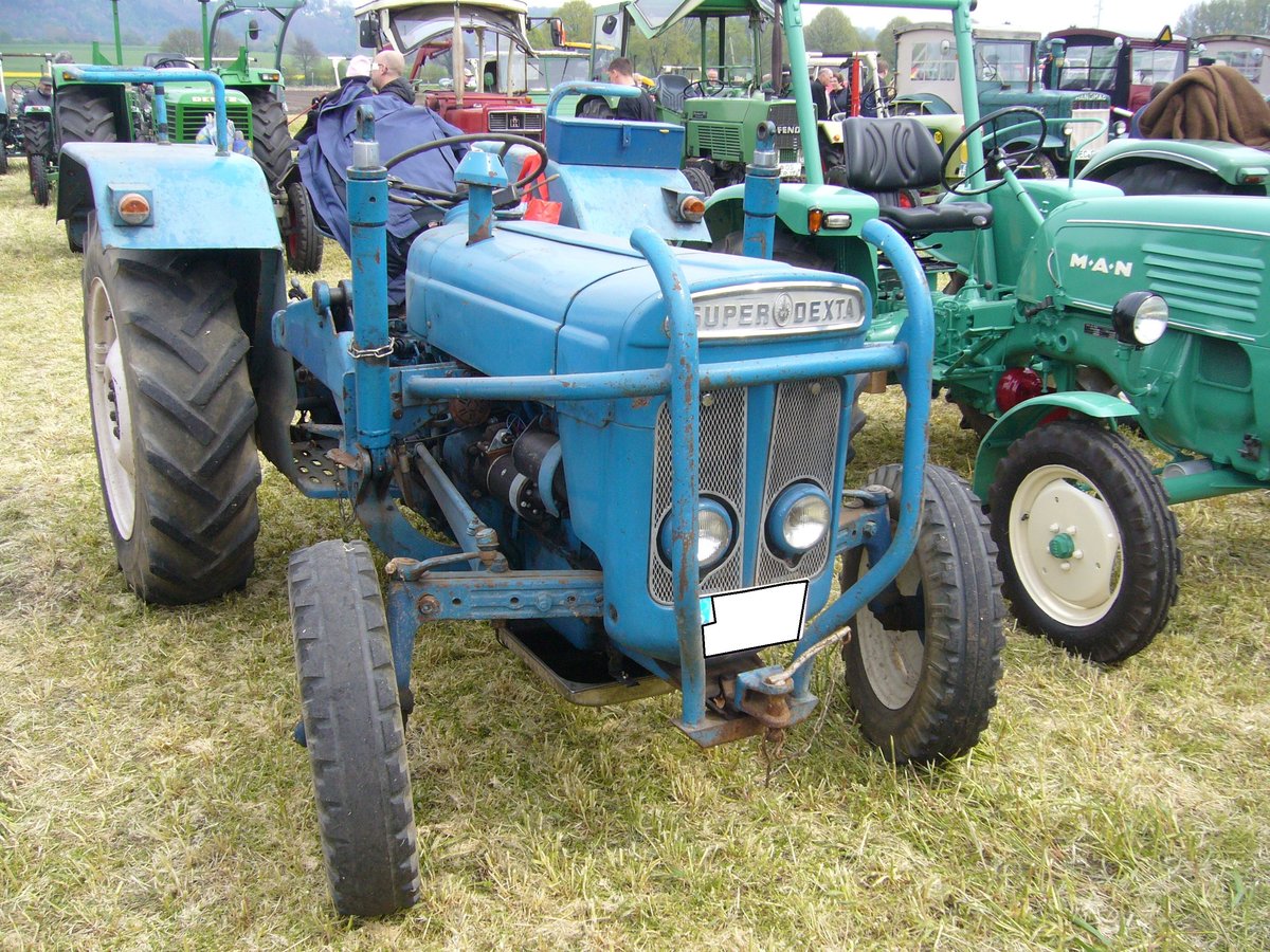 Fordson Super Dexta. 1960 - 1965. Fordson war die Traktorenmarke der Ford Motor Company. Der abgelichtete Super Dexta wurde 1964 produziert. Dieses Modell konnte auch mit Allradantrieb geordert werden. Der wassergekühlte 3-Zylinderreihenmotor hat einen Hubraum von 2868 cm³ und leistet 45 PS. Treckertreffen Wechte am 01.05.2017.