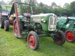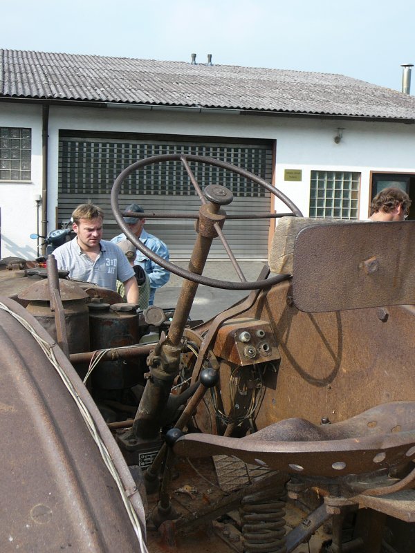 der spartanisch ausgestattete Arbeitsplatz des Lanz-Bulldog (kein Display, kein Joystick aber ein Eisenlenkrad), gesehen beim 4. Tanner Bulldog- und Oldtimertreffen am 20.09.09