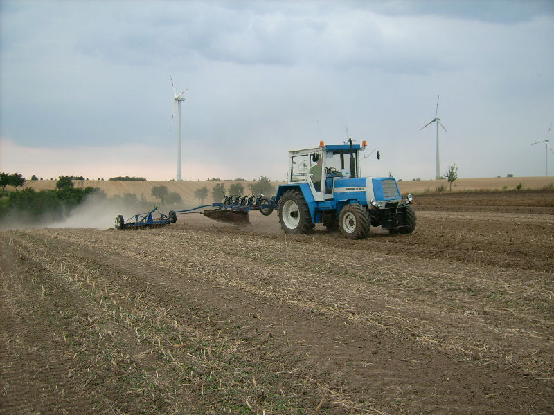 Der Rottelsdorfer ZT323 mit Aufsattel-Beetpflug B-201 fährt neben der Ackerfläche wieder zurück zur Anfangsfurche