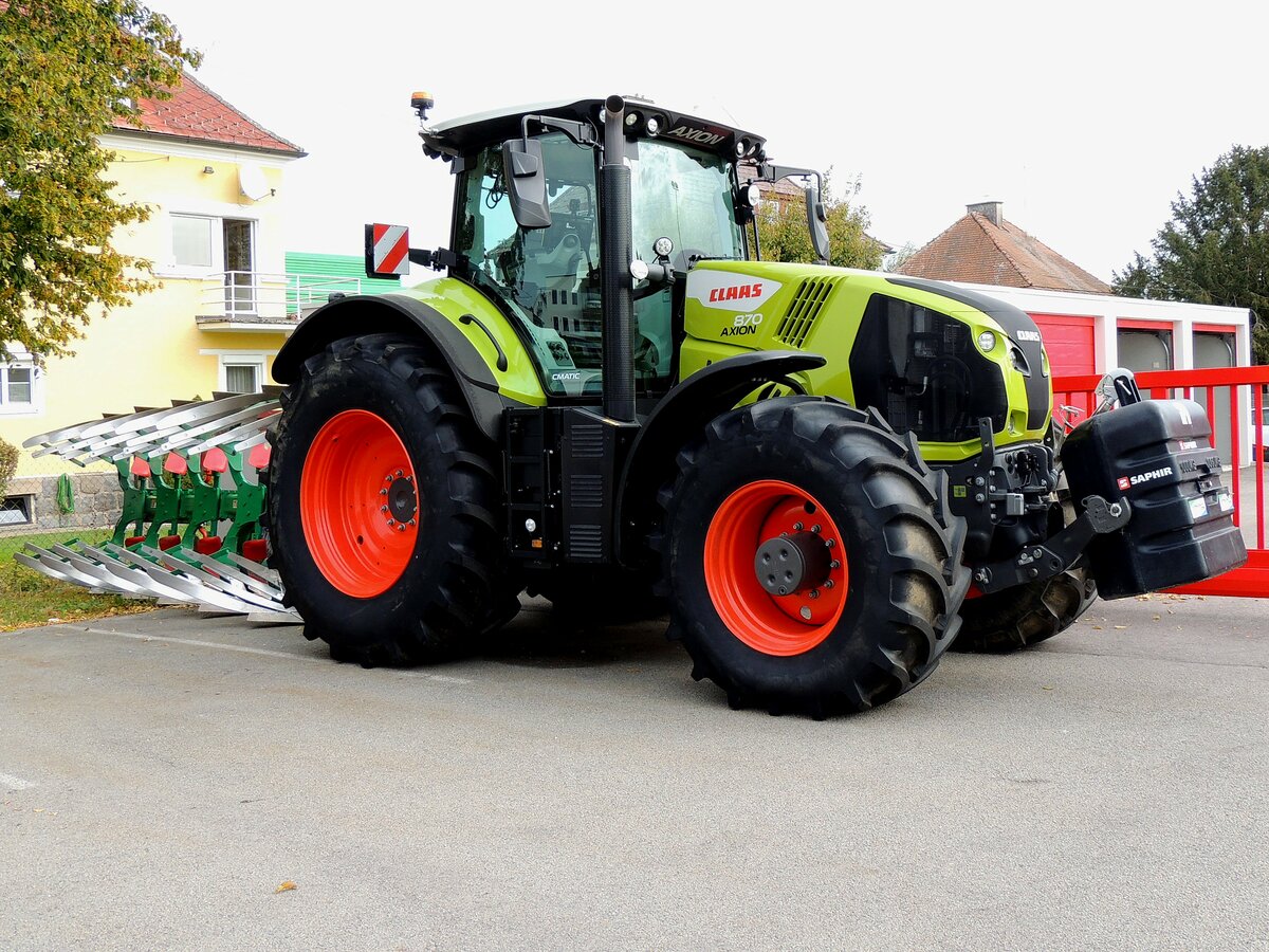 CLAAS AXION-870 (217kW; 6728ccm; 50km/h;Produktionszeitraum 2016-19) wurde nächst der Agrar HTL-Ried mit Wendepflug zur Schau gestellt; 231009