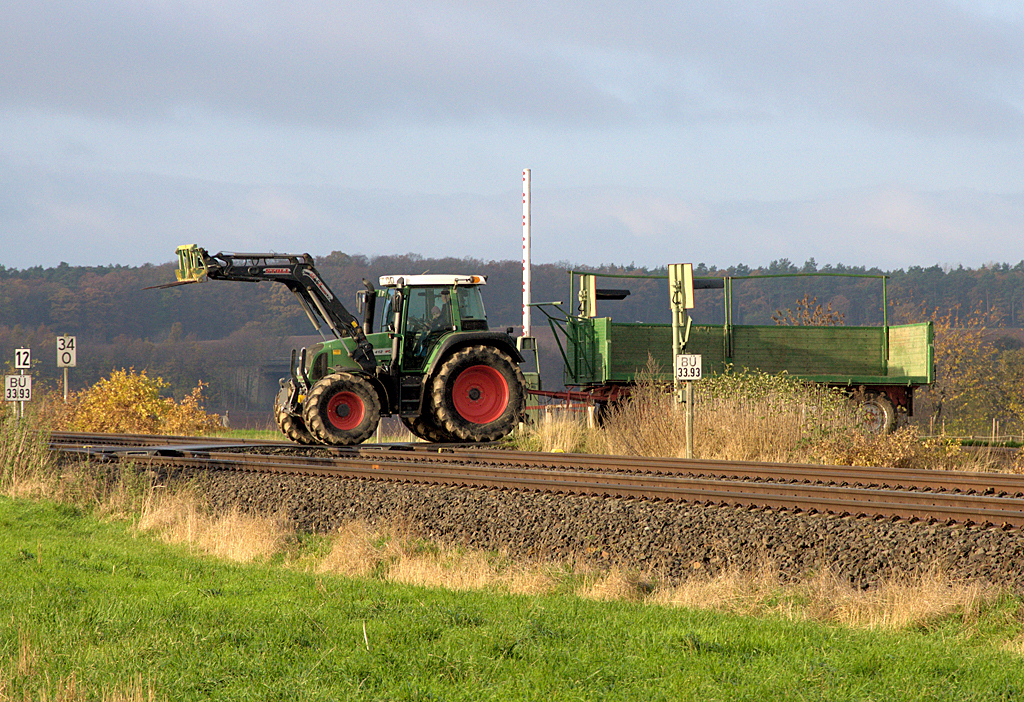 Fendt 412 mit Hänger kreuzt Bahnübergang bei Eu-Wißkirchen - 30.11.2013