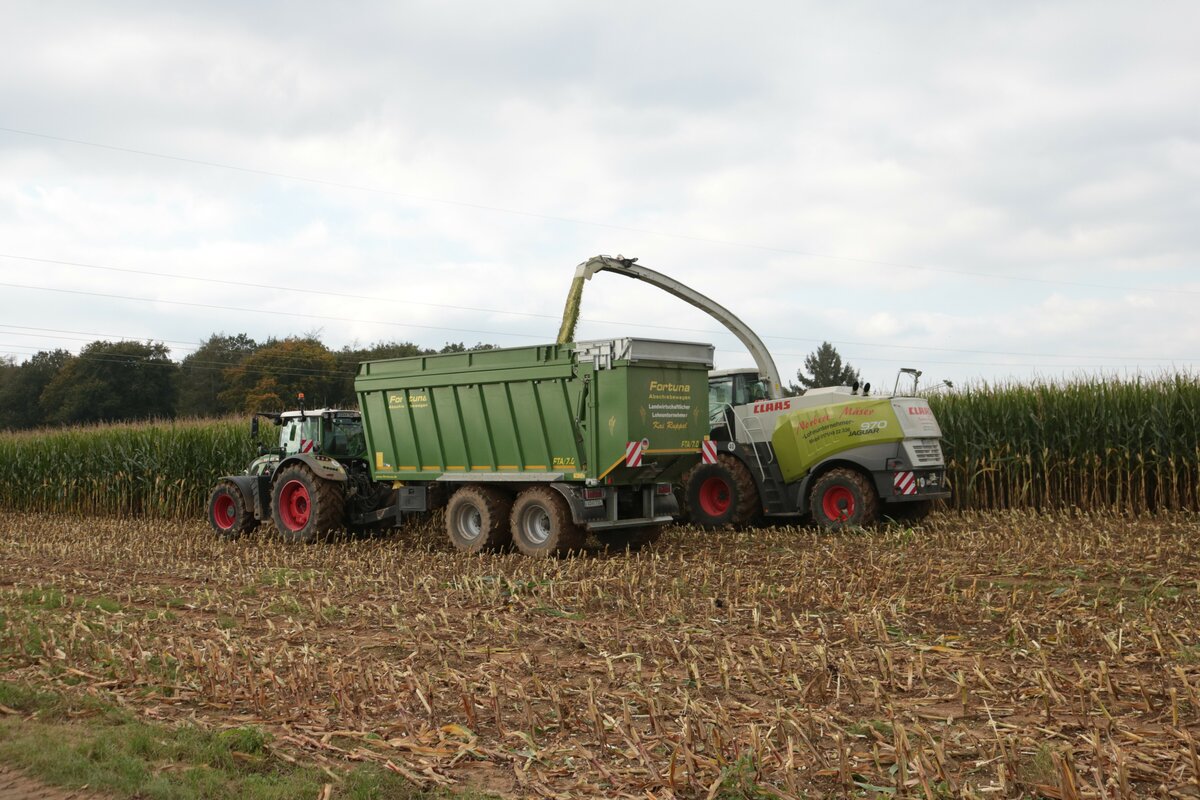 Kai Ruppel Fendt One 724 mit Fortune Abschiebewagen am 28.10.21 bei der Maisernte in der Wetterau