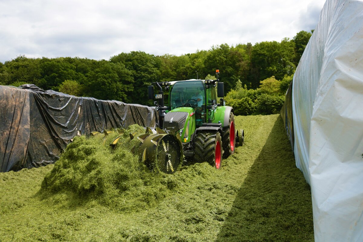LU Schmidt Ronneburg beim Silieren des 2. Schnitt im Silo am 26.05.22 in Ronneburg im Main Kinzig Kreis mit zwei Fendt Vario 724