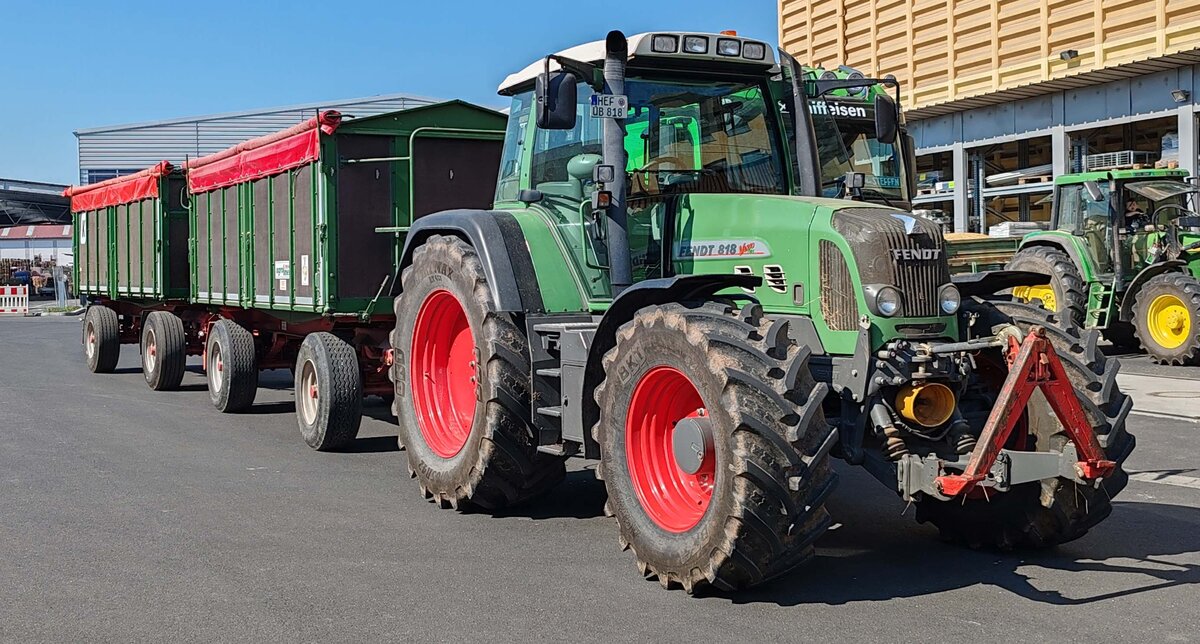 =Fendt 818 Vario steht mit Anhängern steht zur Entladung am Kornhaus Hünfeld, August 2015
