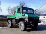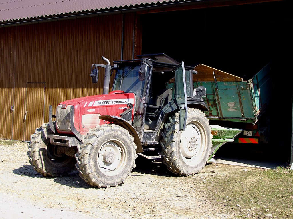 MF-4445 bei der Befüllung des angekoppelten Kunstdüngerstreuers aus einem Anhänger; 120318