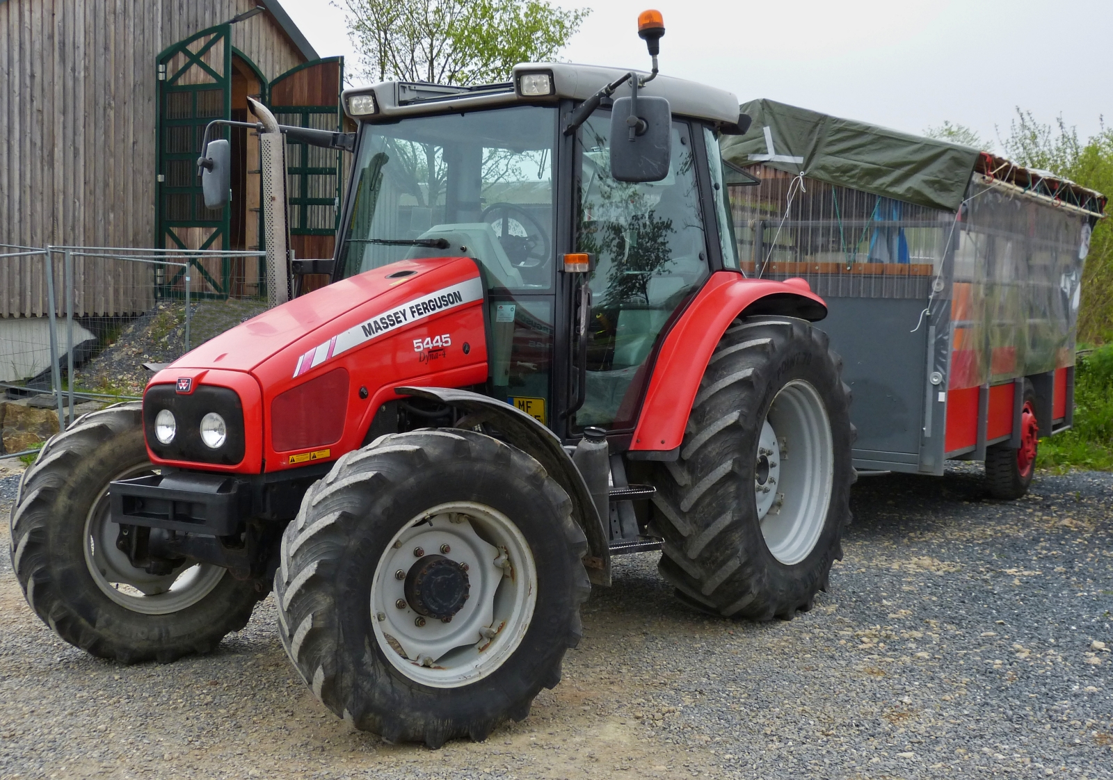 Massey Ferguson 5445 steht mit Hänger bereit um Mitfahrer auf die Rundfahrt Vintage Fuussekaul mitzunehmen. 09.5.2023
