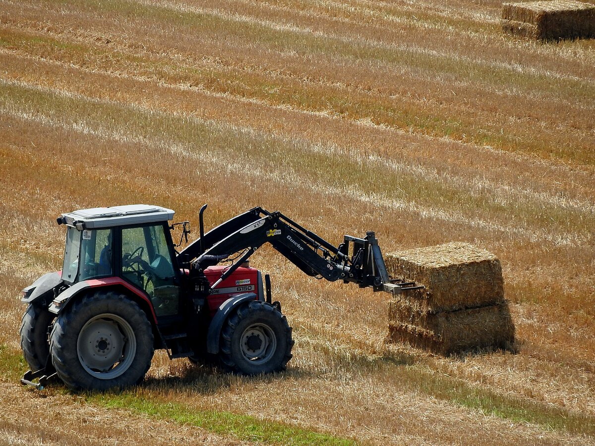 MF6150 stapelt mit dem angebauten Frontladerarm Strohballen; 210813