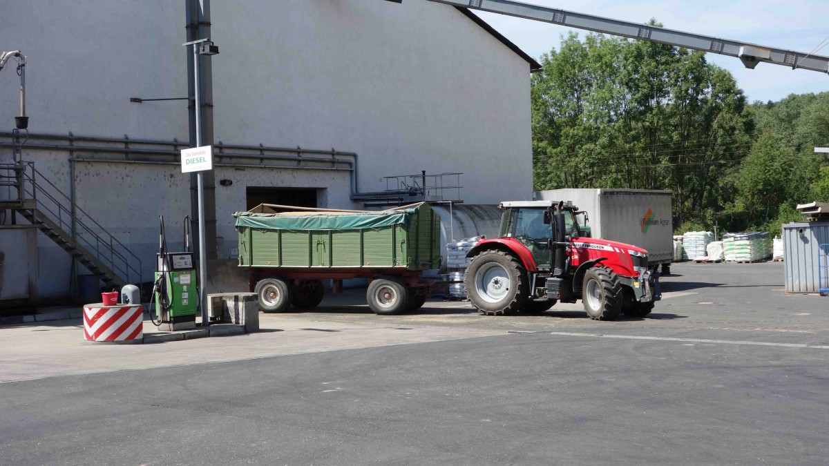 MF 7314 steht mit Anhänger steht zur Entladung am Kornhaus Hünfeld, August 2015