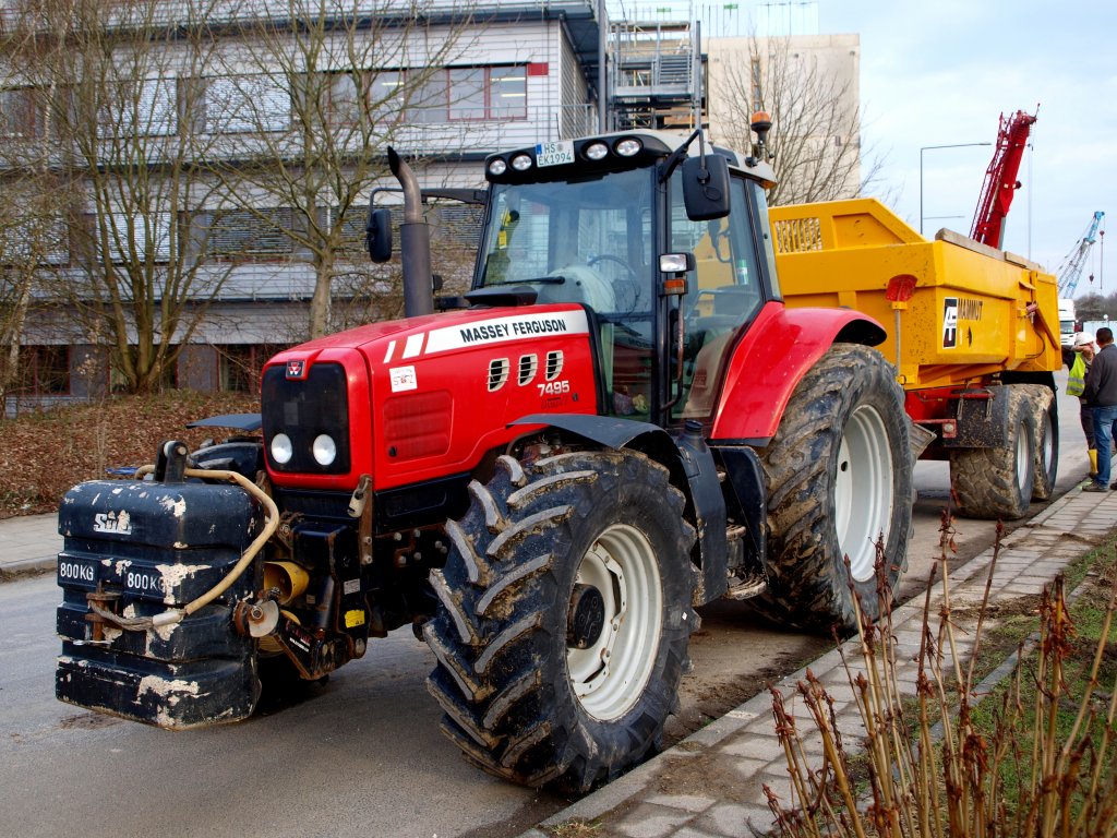 Ein Massey-Ferguson 7495 (200PS) mit einem Mammut Tandem-Muldenkipper am 14.2.2011 an der Campusbaustelle der Rwth in Aachen. Der Traktor hat ein 800kg Gewicht an der Fronthydraulik um die Kraft des Schleppers im Gelände auf alle Räder zu bringen.