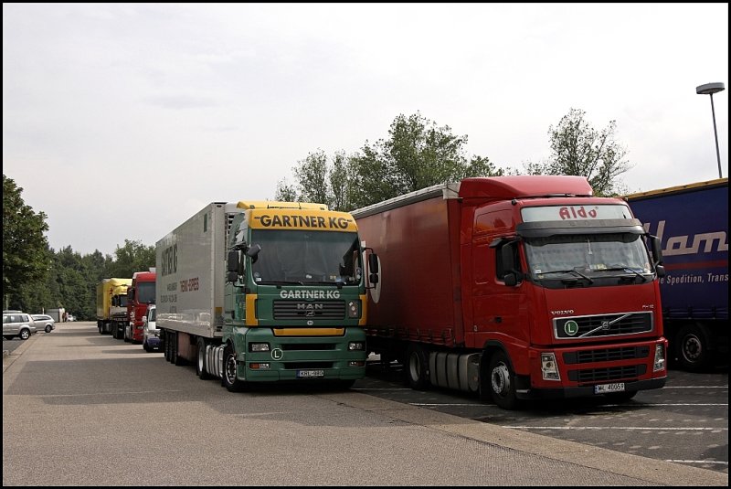 GARTNER Special No17: Wirtschaftskriese?!? Ein MAN TGA 18.440XXL der GARTNER INTERTRANS HUNGÀRIA und ein Volvo FH12 420PS aus Polen stehen mit weiteren Lkw´s aus Osteuropa auf den Pkwstellplätzen. Sieht so die Wirtschatfskriese aus?!?