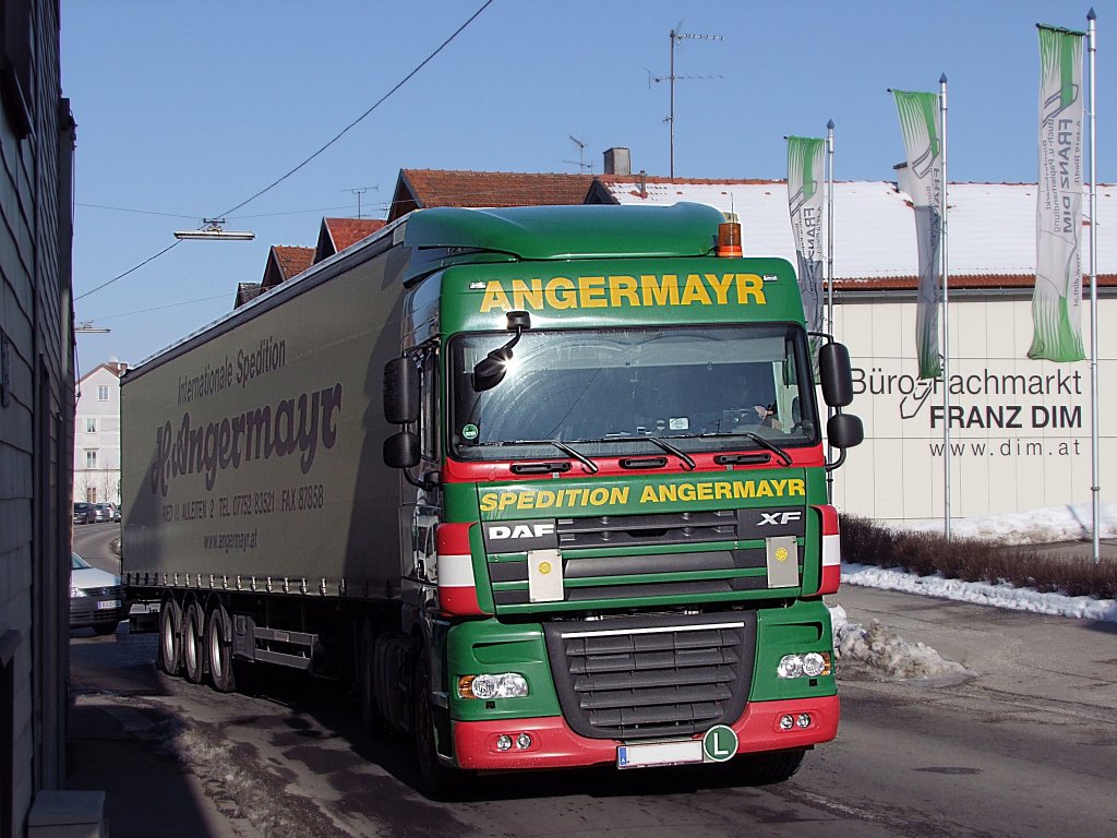 Die Sattelzüge (hier XF105.480)der Sped.Angermayr müssen sich durch die engen Innenstadt-Straßen von Ried quälen, um an ihre Betriebstätte zu gelangen; eine geplante Umfahrung (Spange-III) lässt aufgrund von Anrainereinwänden womöglich noch Jahre auf sich warten;110128