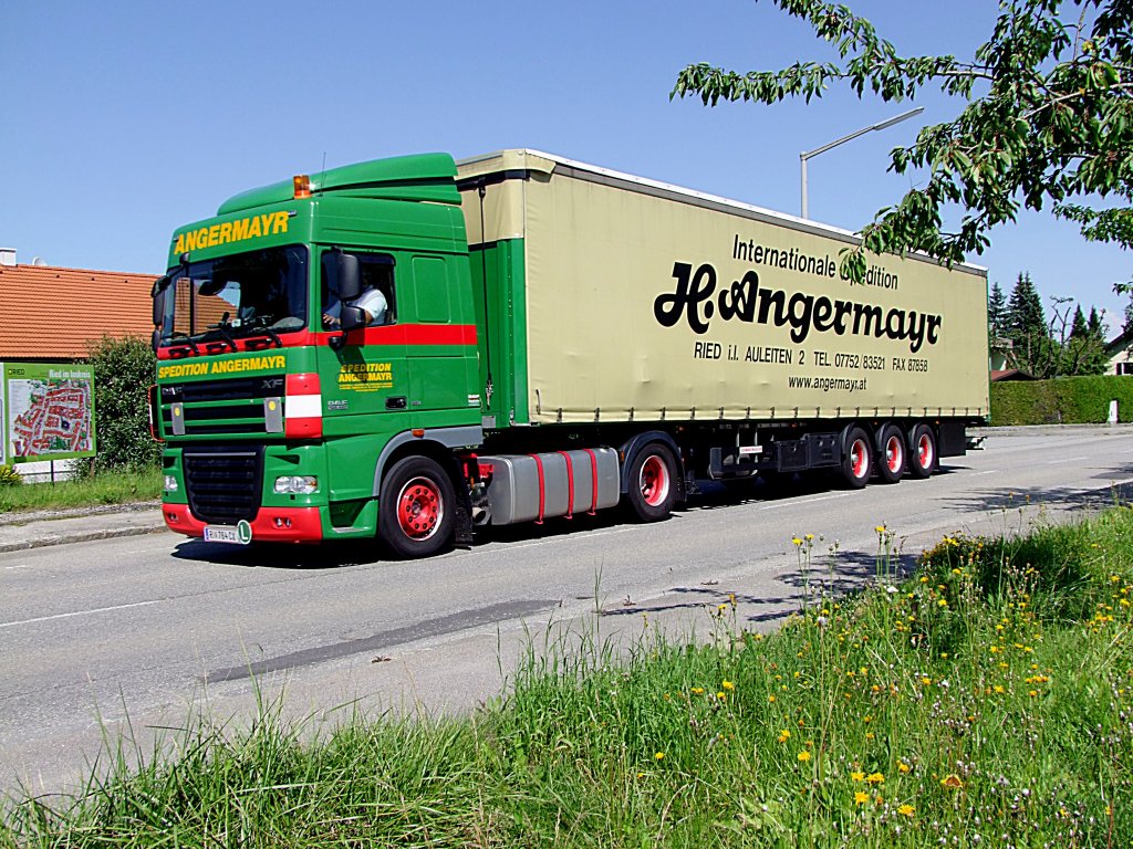 DAF XF450 der (ehem)Sped.ANGERMAYR verlässt mit einem Gefahrgutauflieger (80-3264=ÄTZENDER SAURER ANORGANISCHER FLÜSSIGER STOFF) die damalige Firmenzentrale; 210528 JohannJ