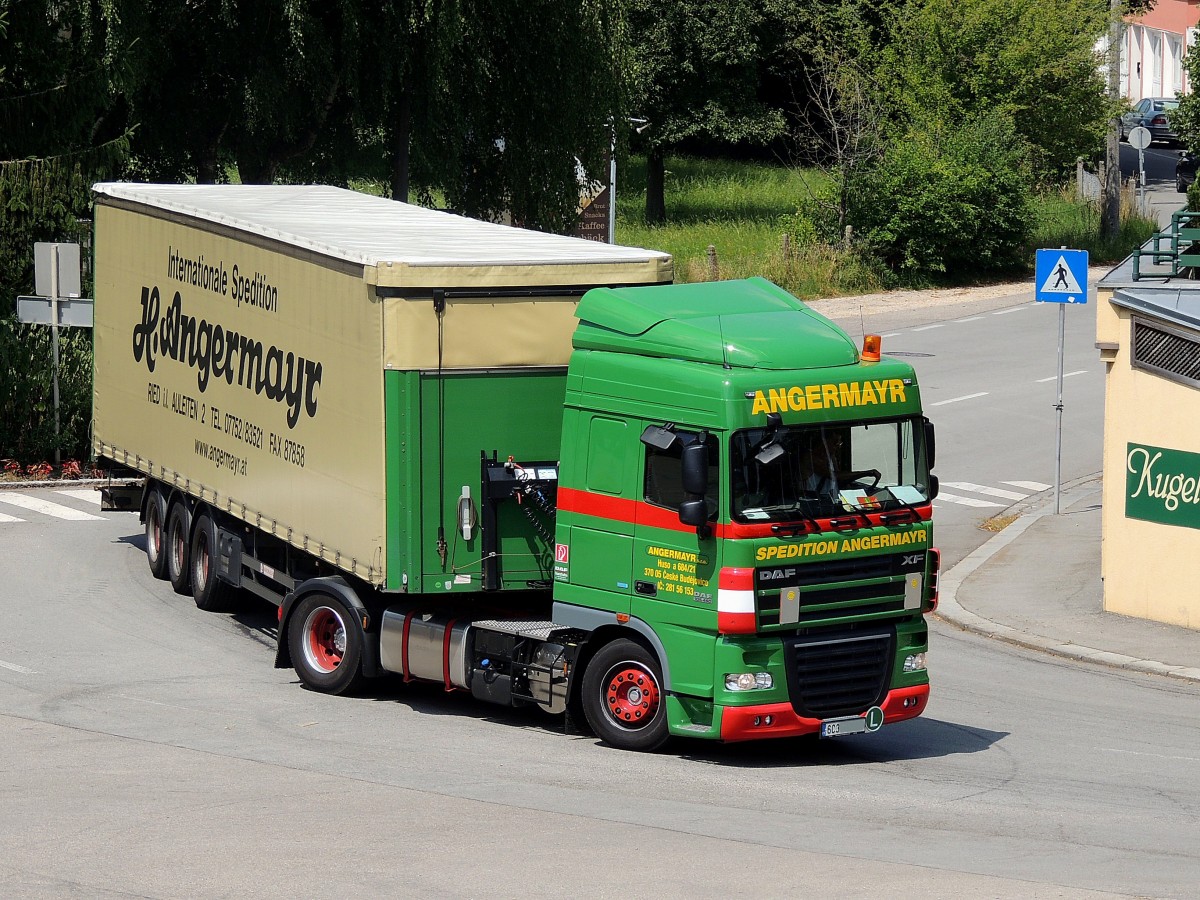 DAF XF450 der (ehem)Sped.ANGERMAYR verlässt mit einem Gefahrgutauflieger (80-3264=ÄTZENDER SAURER ANORGANISCHER FLÜSSIGER STOFF) die damalige Firmenzentrale; 210528 JohannJ