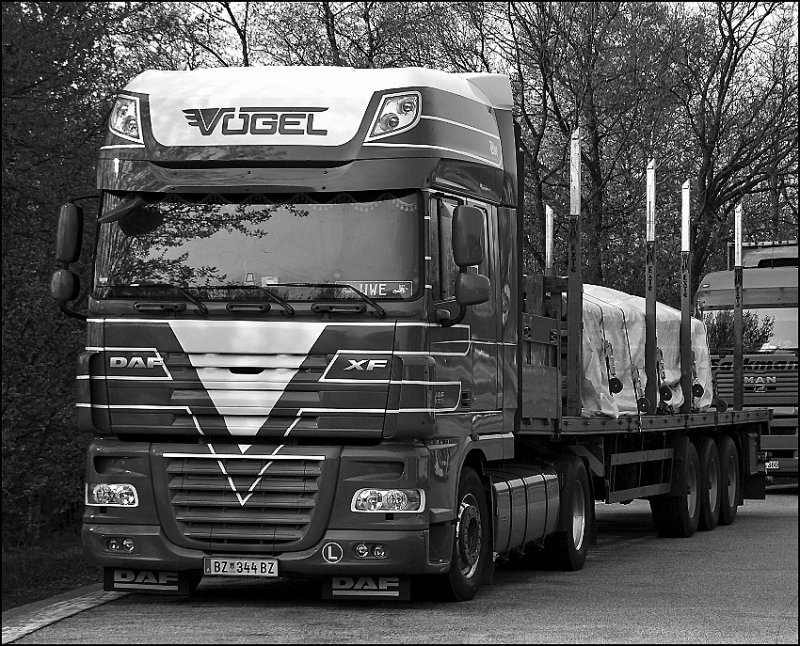 DAF XF105.460SSC "SuperSpaceCab" der Spedition VÖGEL aus Bludesch/Voralberg. In Schwarz-weiß.