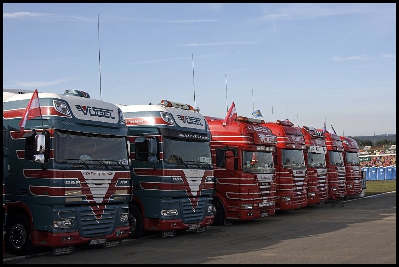 DAF XF105.460SCC "SuperSpaceCab" "We fliy hight", DAF XF105.460SCC "SuperSpaceCab" "THE Flying Dutchman", SCANIA TOPLINE 144L 530 aus Bludesch/Voralberg, SCANIA TOPLINE R500 \8/ "Red xBriffing(??), SCANIA TOPLINE R500 \8/ aus Lichtenstein, SCANIA TOPLINE R580 \8/ aus Italien und ein DAF XF105.460SCC "SuperSpaceCab" aus Lichtenstein.