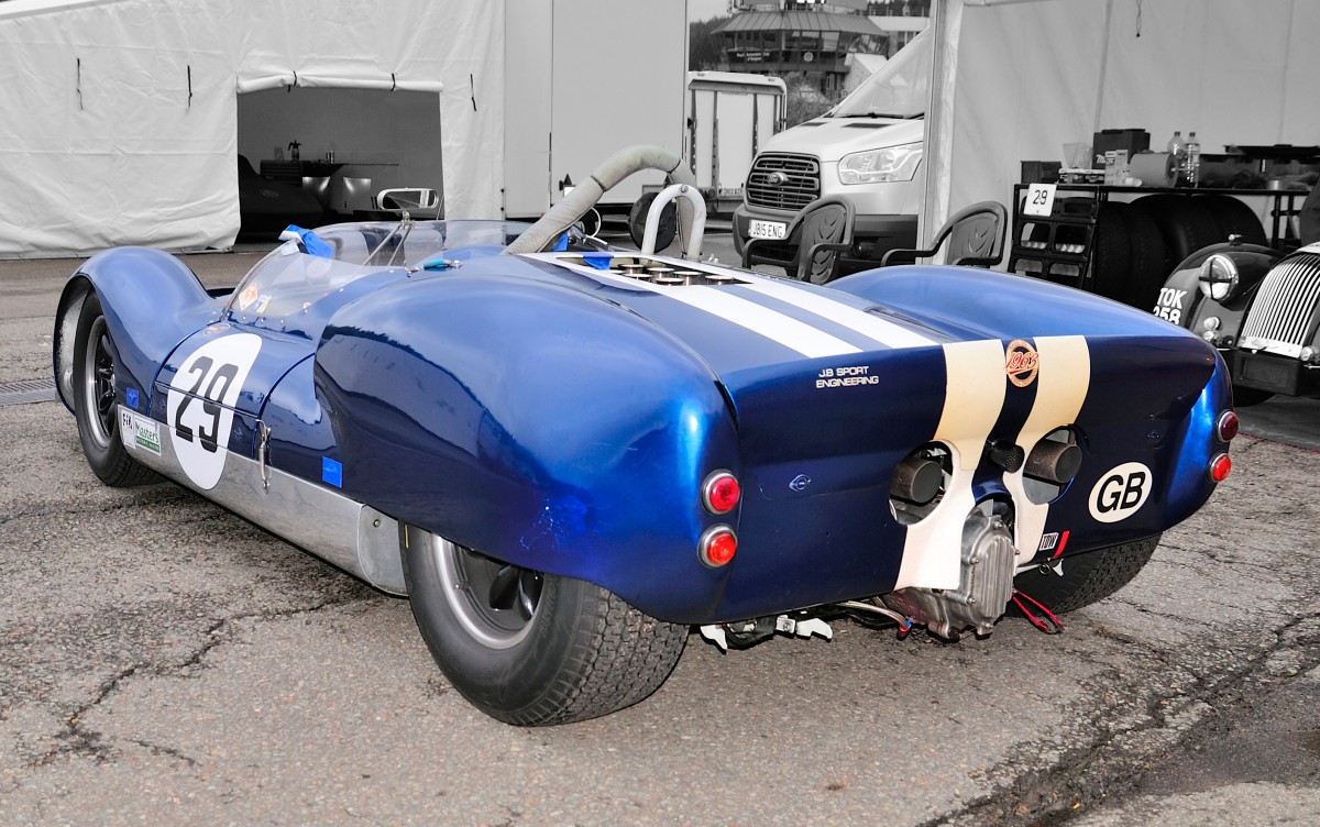 Heckansicht der Shelby Cooper Monaco King Cobra, Bj.1963, 4700ccm soll am 20.Sep.2015 beim FIA Masters Historic Sports Car Championship zum Einsatz kommen. Hier im Fahrerlager am 19.9.2015 in Spa Francorchamps