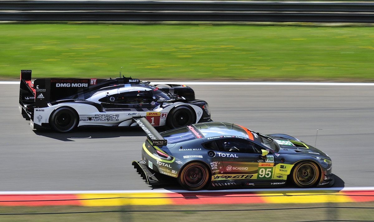 Bei der FIA WEC gibt es sehr viele Überholmanöver, aleine schon der unterschidlichen Fahrzeug Typen. Nr.95 von Aston Martin Racing, Aston Martin Vantage GTE hat keine Chance gegen dere Nr.1 Porsche 919 Hybrid ( ca. 1000 PS)