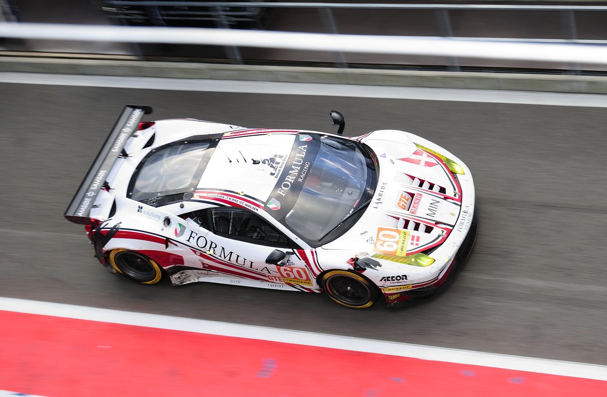 LMGTE Nr.60 Ferrari F458 Italia, FORMULA RACING bei der European Le Mans Series am 25.9.2016 in Spa Francorchamp. Aufnahme von der Frei zugänglichen Dachterrasse der Boxen.