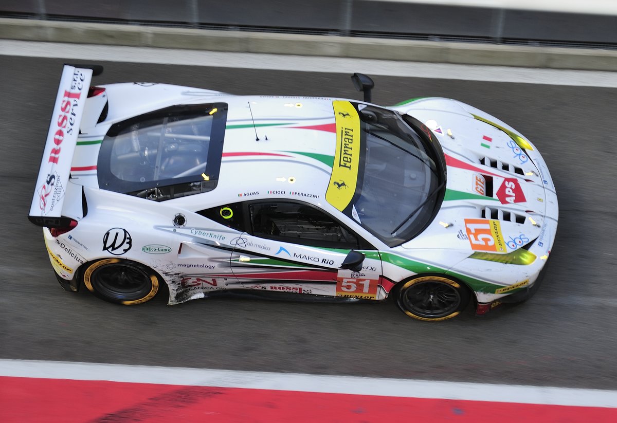 Mitzieher vom Dach der Boxenanlage, AF Corse Nr.51, Ferrari F458 Italia der LMGTE Klasse nach einen Tankstopp, European Le Mans Series am 25.9.2016 in Spa Francorchamp