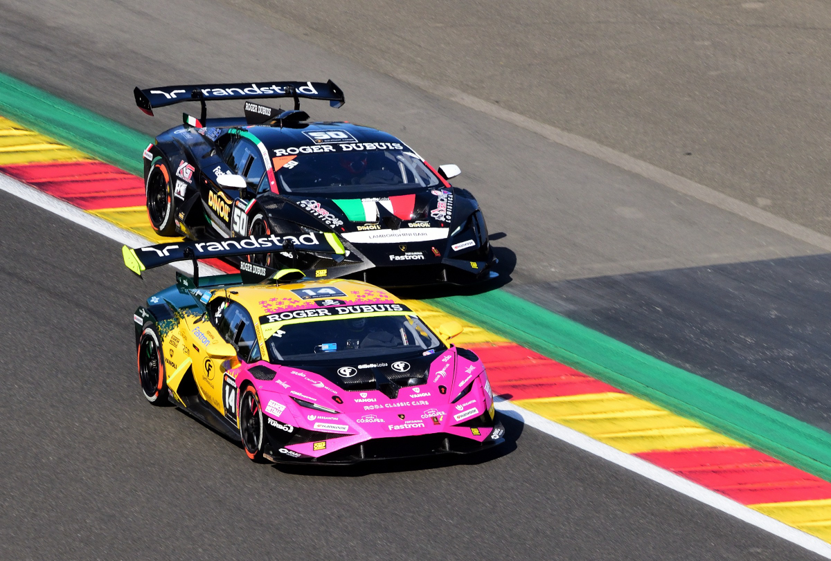 #14 P. Perolini / D. Roda, Team Oregon Team Lamborghini Huracan Super Trofeo EVO2A, gefolgt vo #50 Fahrer: R. Ianniello / R. Testa Team: DL Racing. Lamborghini Super Trofeo Europe eine der am stärksten umkämpften Markenmeisterschaften der Welt, im Rahmenprogramm der FIA WEC 6h Spa Francorchamps am 11.5.2024