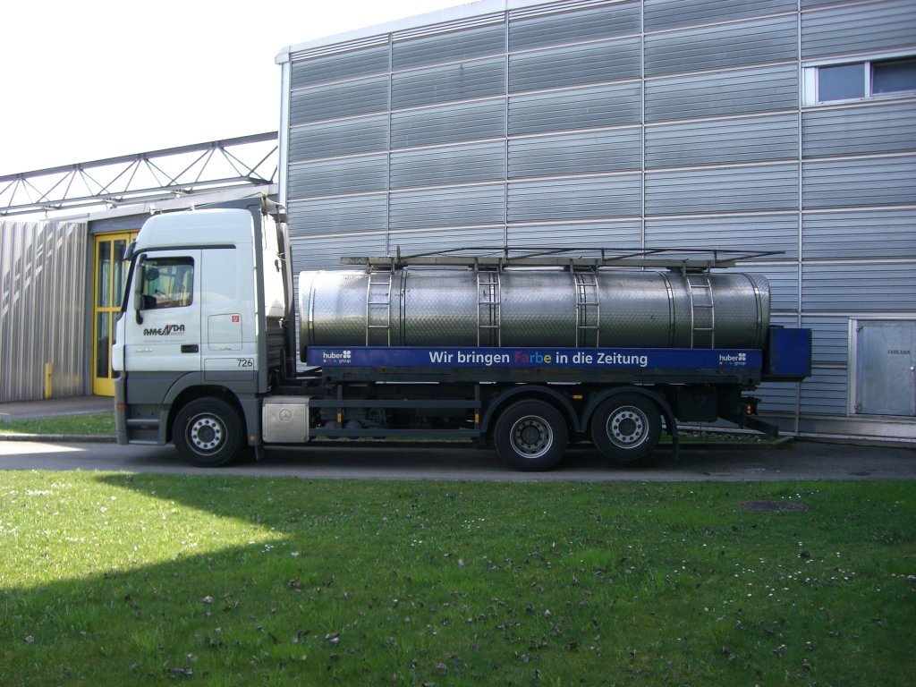 Mersedes MP 3 von Amenda Transporte mit Huber - Farben Tankwechselbrücke Aufgenommen am 10.04.2009 in Kirchheim bei München