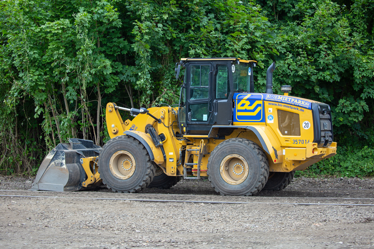 Radlader von CATERPILLAR bei Gleisbauarbeiten auf dem Bahnhof Sassnitz im Einsatz. - 20.08.2021