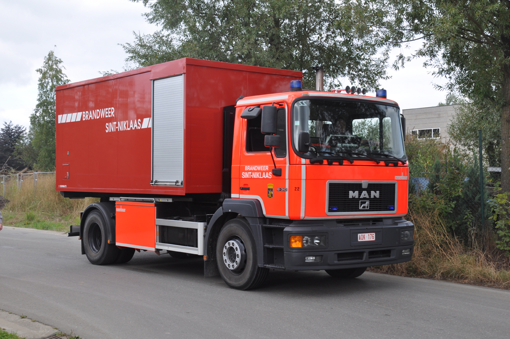 Wechselladerfahrzeug MAN 19.343 4x2 FLC Aufbau Sefa-Marrel & Rosenbauer Belgium der Feuerwehr Sint-Niklaas, Aufnahme am 15.09.2012