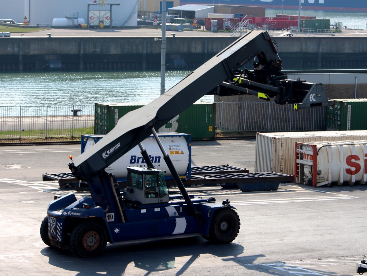 Ein Kalmar Containerstapler am 22.04.2014 im Hfen von Zeebrügge.