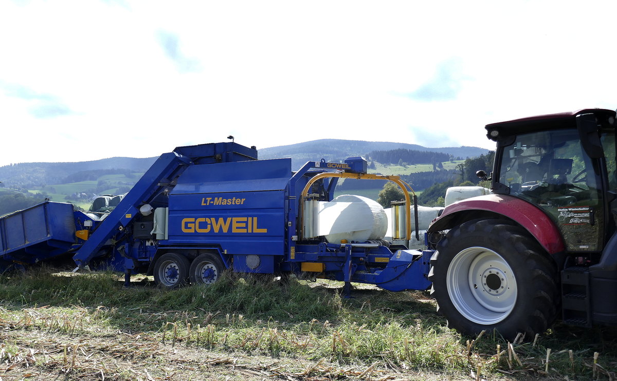 LT-Master bei der Arbeit,kompletter Arbeitsvorgang im Bild, links Anlieferung von Maishäcksel, per Förderband in die Rundballenpresse, dann einwickeln in Folie und seitlich auswerfen, rechts der Zapfwellenantrieb durch den Traktor, Sept.2020 rainer ullrich