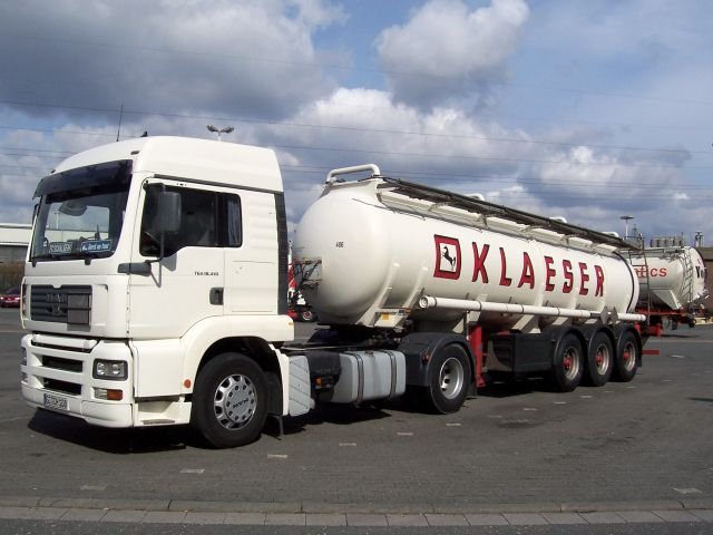 Klaeser fährt einen weißen MAN TGA 18410 LX Säure/Lauge Sattelauflieger Spedition Hans Klaeser Herten gesehen am 11/04/2006 in Marl