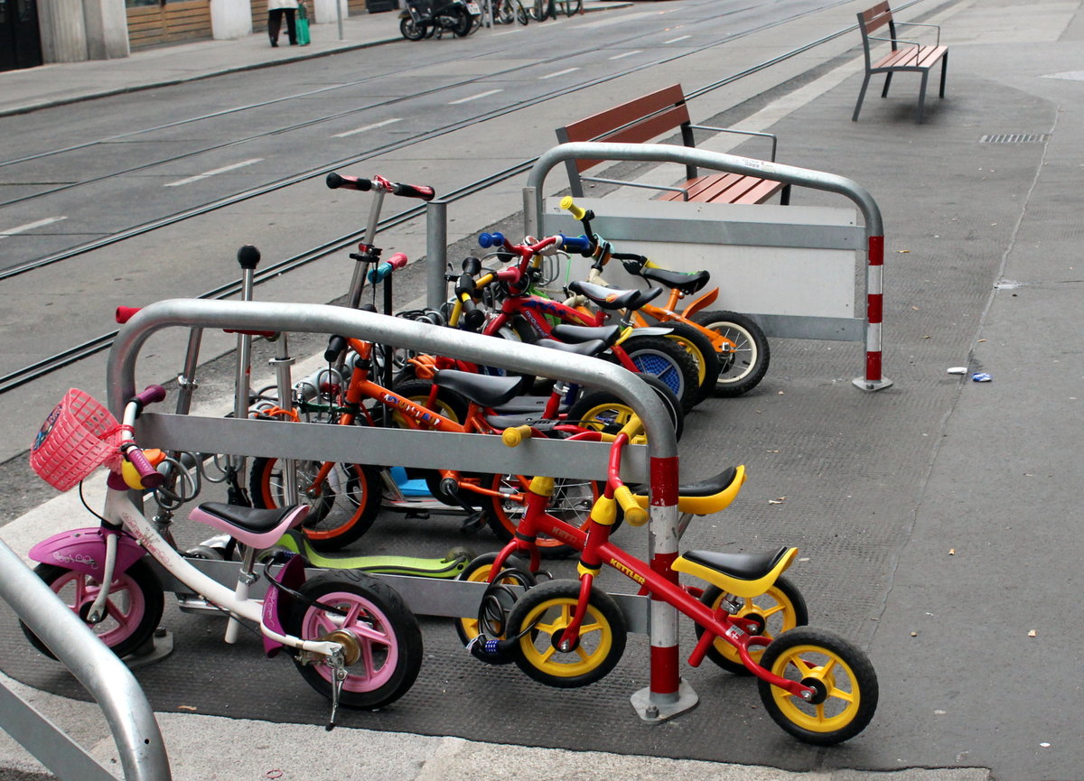 Wien-Josefstadt am 17. Oktober 2016: Vor dem städtischen Kindergarten in der Josefstädter Straße 93-97 gibt es einen außergewöhnlichen Parkplatz - und zwar einen Parkplatz für Kinderfahrräder und andere Kinderfahrzeuge.