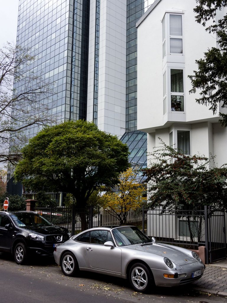 Porsche 911 (993) parkiert vor einem Wolkenkratzer in Frankfurt (Main) am 07.11.2012.