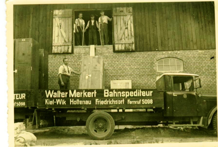 Walter Merkert (auf der Ladefläche) mit seinem Mercedes L 2000, Baujahr 1933 mit 55 PS Benzinmotor im August 1939 beim Laden von Schränken bei der Standortverwaltung in Dänisch-Nienhof (Schwedeneck). Der zweite Lke, ein Opel-Blitz ist nur links am Bildrand zu sehen. Michael Merkert