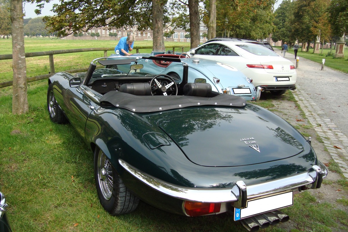 Jaguar E-Type Roadster V12. 1971 - 1974. Der E-Type mit dem V12-motor war die letzte Ausbaustufe des E-Type. Der V12-motor leistet 276 PS aus 5343 cm³ Hubraum. Schloß Nordkirchen im Münsterland am 05.09.2014. Michael H.