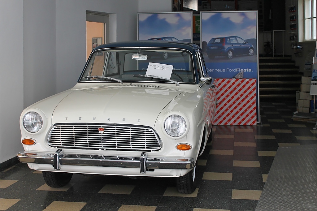 Sieht so aus, als wäre die Zeit stehen geblieben - ein neu aussehender Taunus im Schaufenster, der "neue Fiesta" auf dem Plakat dahinter ist es auch nicht mehr.
