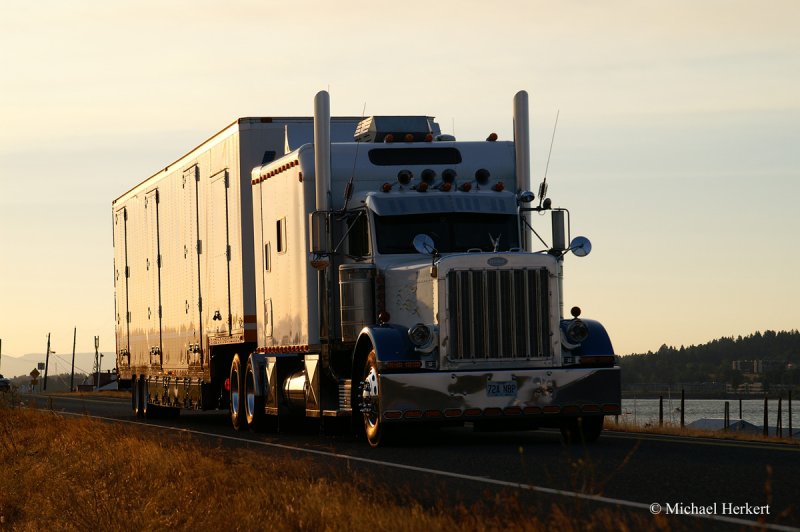 Ein schöner Peterbilt 379 mit großem Sleeper bei schönem Abendlicht auf dem Marine Drive in Portland, Oregon. August 2008