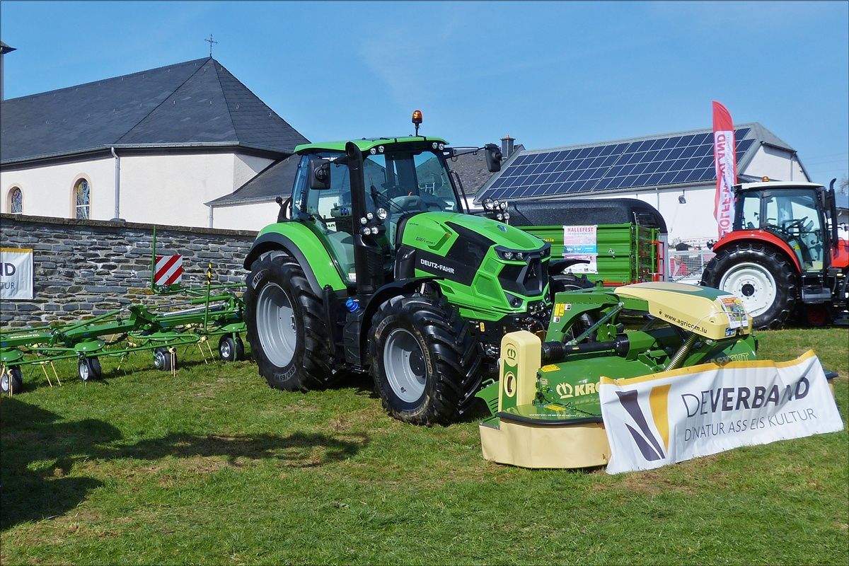 Deutz - Fahr 6165 mit angehängtem Krone Mähwerk an der traktorfront, ausgestellt beim Bauerntag in Brachtenbach. 26.03.2017