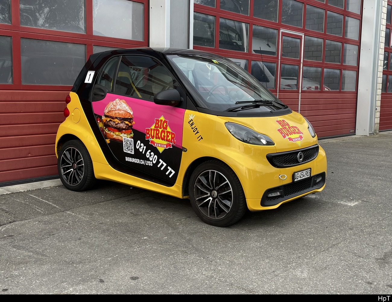 Gelb - Schwarzer Smart mit Werbung abgestellt in Worben vor einem Garage am 10.06.2023