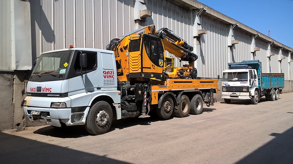 BMC mit Kran und Ford Pritsche in Inegöl, Türkei, am 11.4.16
