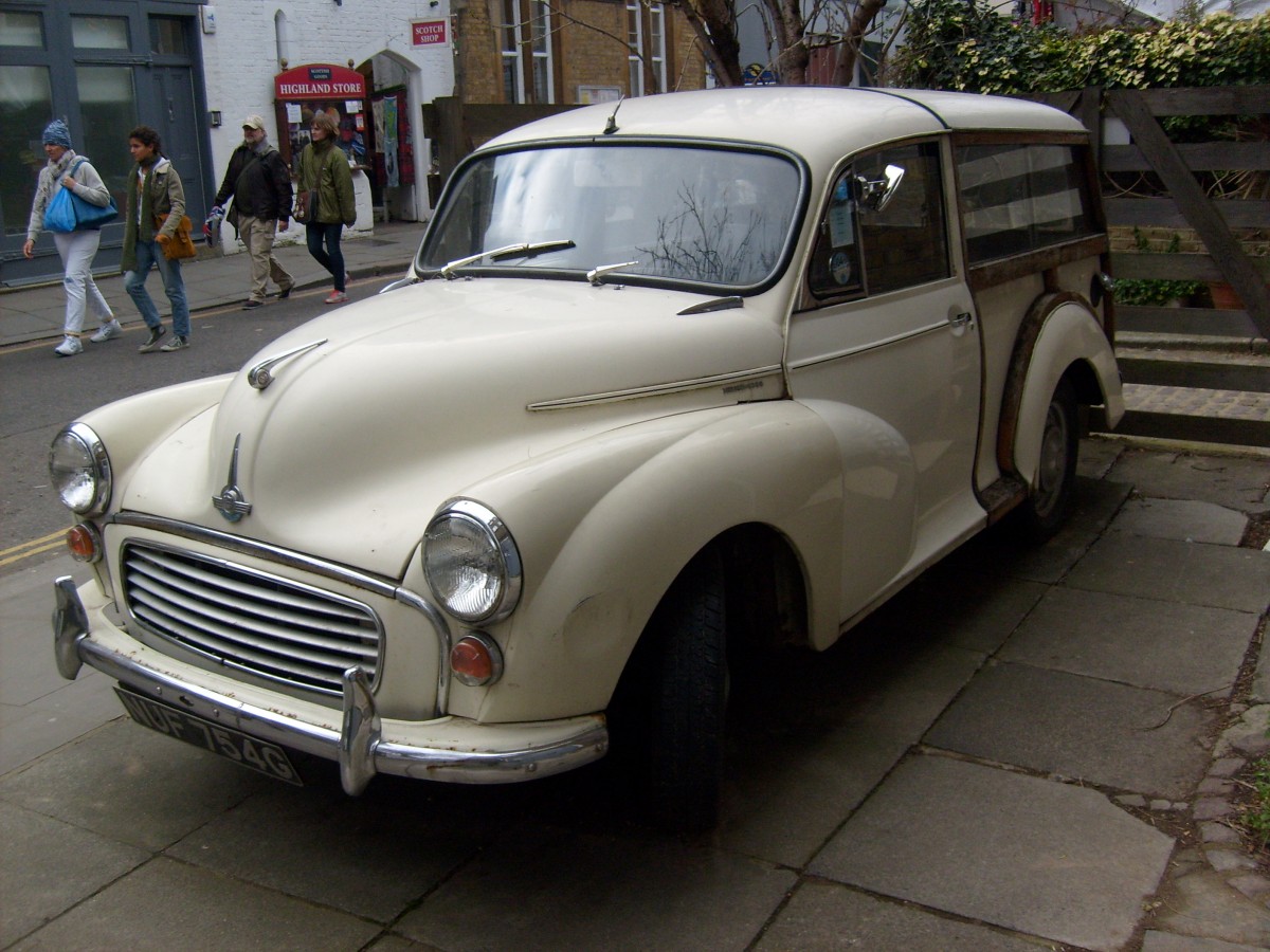 Morris Minor 1000 Traveller. 1956 - 1971. Der britische "Volkswagen" Minor wurde bereits 1948 als MM vorgestellt. Im Laufe seiner Produktionszeit erfuhr der Minor etliche Facelifts und Änderungen in der Motorisierung. Diesem, am 28.03.2015 in Nottinghill abgelichteten Minor, sieht man das harte Alltagsleben des Londoner Großstadtverkehrs an. Michael H.
