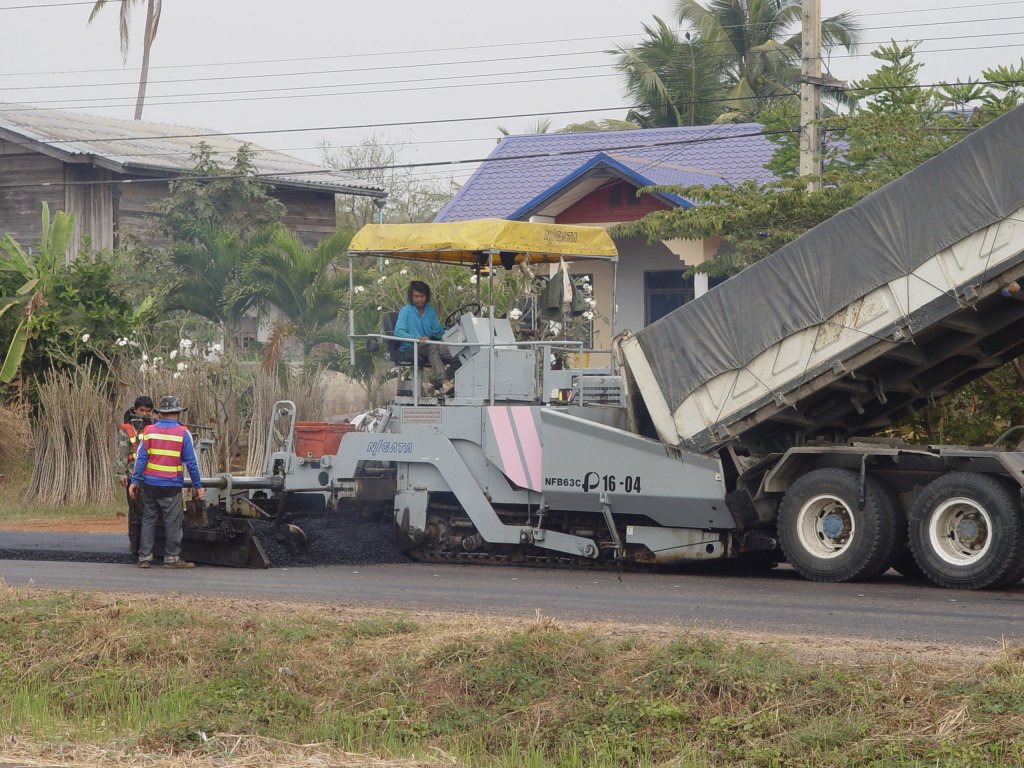 Eine japanische Asphaltiermaschine NIIGATA NFB63C bei der Stadt Nang Rong im Nordosten Thailands am 17.01.2011