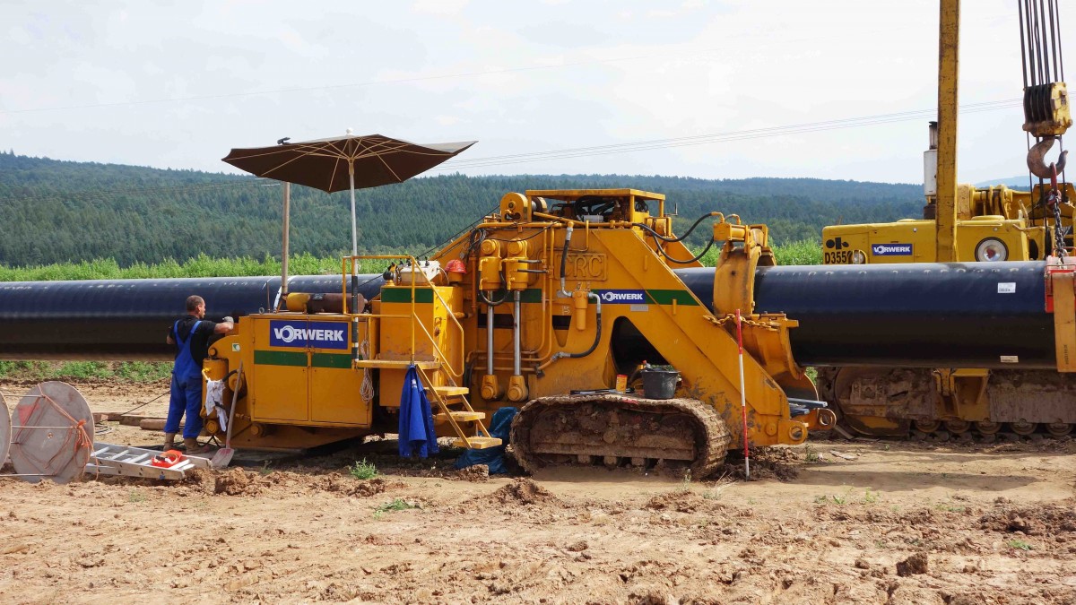 Das Bedienpersonal bereitet die nächste Rohrbiegeaktion zum Biegen des eingespannten Gasrohres vor (gesehen an der MIDAL-Trasse in 36100 Petersberg-Marbach)