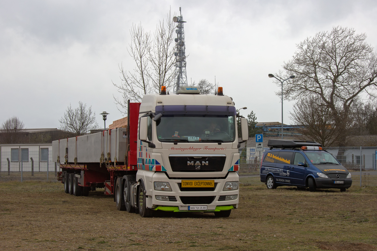 Begleitfahrzeug und Schwertransport MAN TGX 26.480 mit Betonschwimmsteg der Marina System GmbH Torgelow. - 19.03.2014