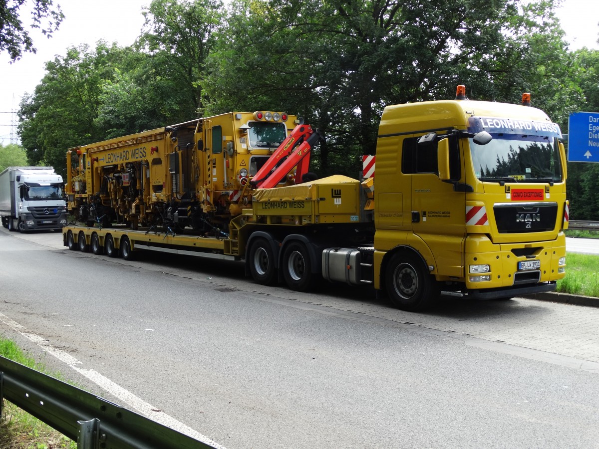 MAN TGM von Leonard Weiss mit einer Gleisstopfmaschiene geladen am 30.05.14 auf einen Parkplatz bei Frankfurt am Main