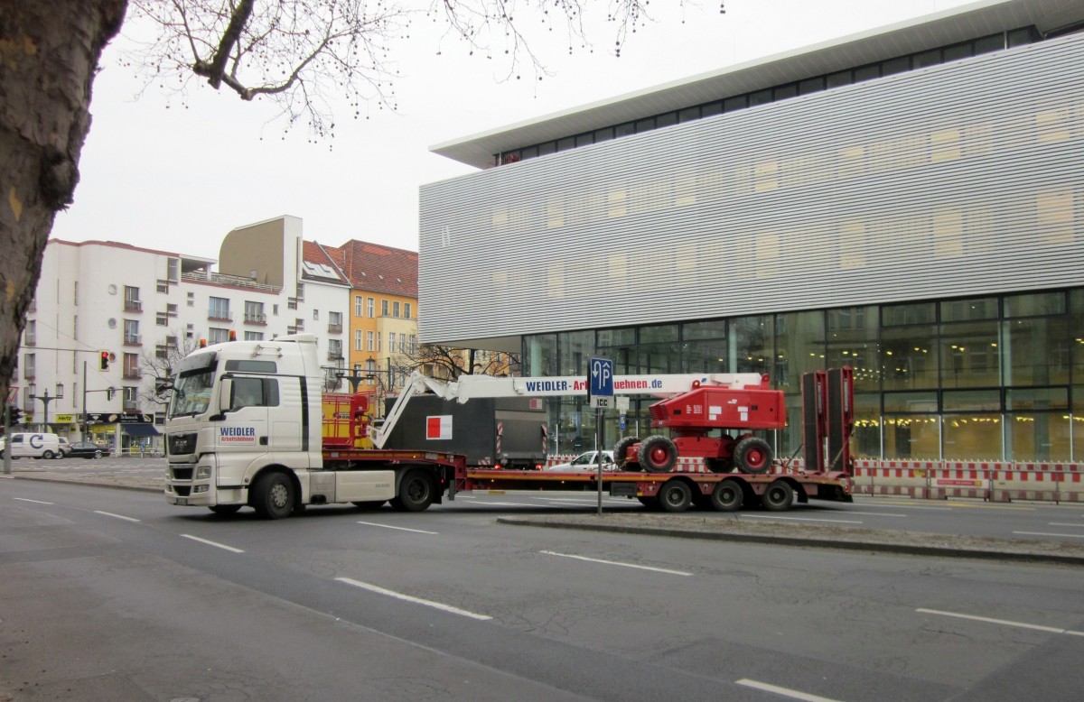 MAN TGX 18.680 mit Sattel-Tieflader. Beladen ist dieser Sattelzug mit einer fahrbaren Arbeitsbühne. Am hinteren Teil der Arbeitsbühne ist gut die Ketten-Sicherung über Kreuz zu sehen , vorne (nicht gut sichtbar) ebenfalls. Im Hintergrund des Bildes ein Teil der im Bau befindlichen  BMW NIEDERLASSUNG BERLIN  am Messedamm. 18.02.2014