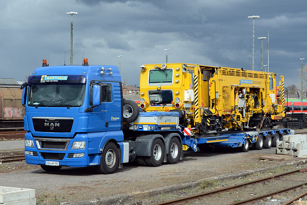 MAN TGX 33.480 mit Schotterplaniermaschine für die Bahn auf dem Auflieger, beim Bahnhof Euskirchen - 25.03.2014
