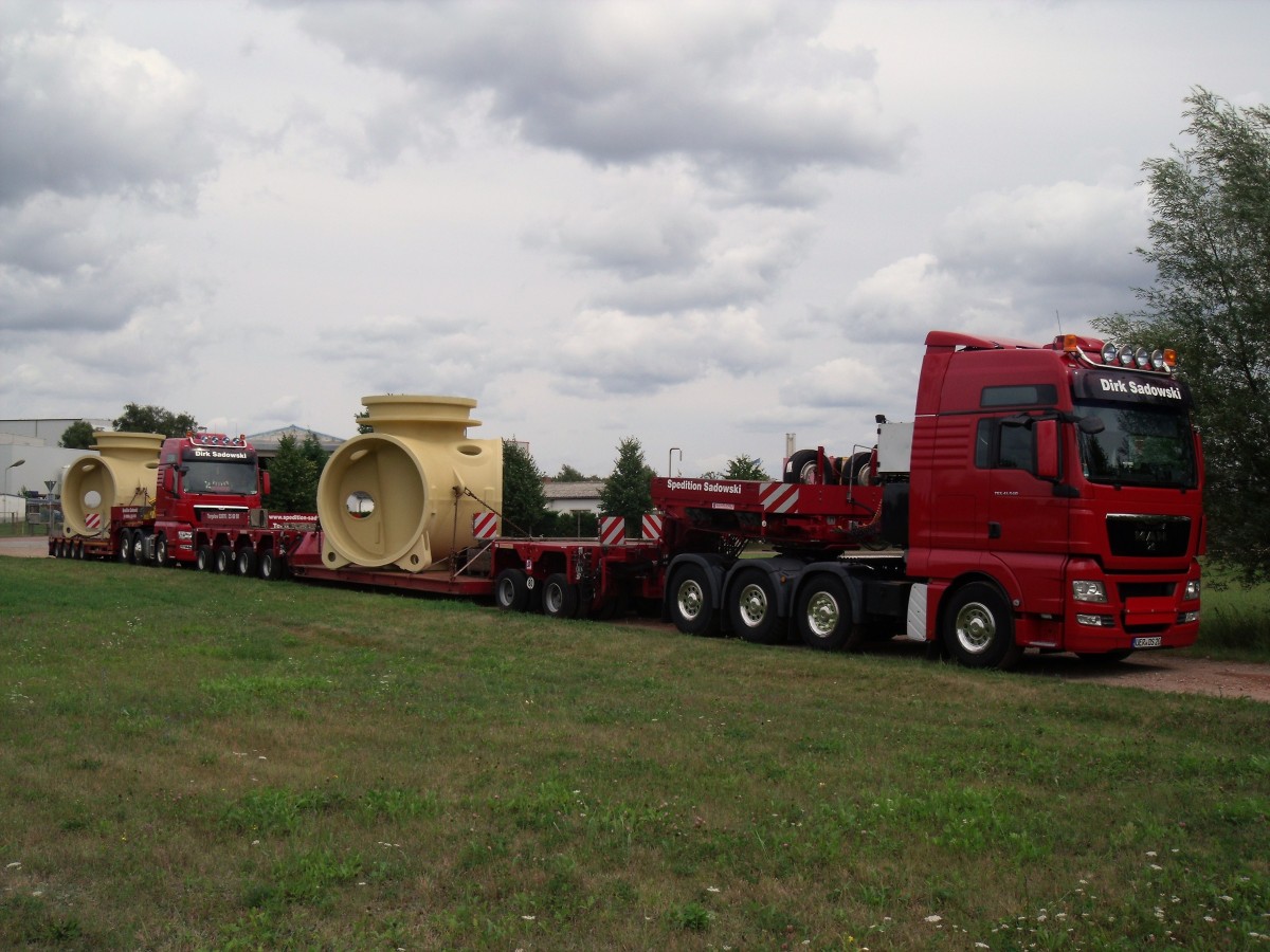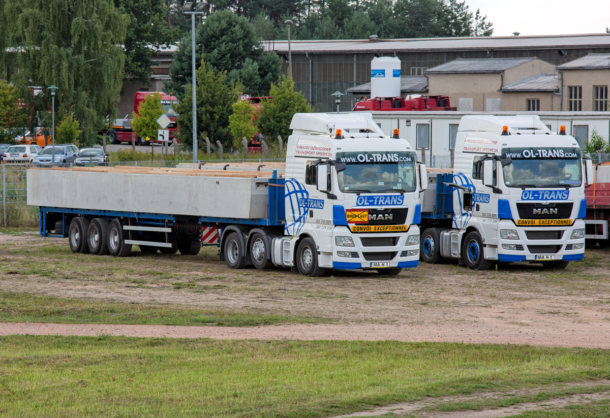 Zwei fast identische MAN beladen mit Betonschwimmstege der Marina Systeme GmbH. - 06.08.2014