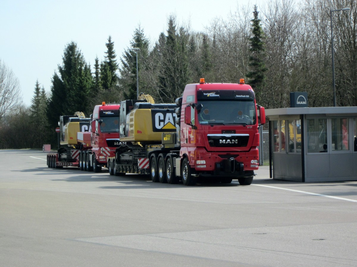 Zwei MAN TGX 41.680 V8 mit Tiefbett-Aufliegern und Cat-Baggern beladen während der MAN Trucknology Days im März 2014 in M.