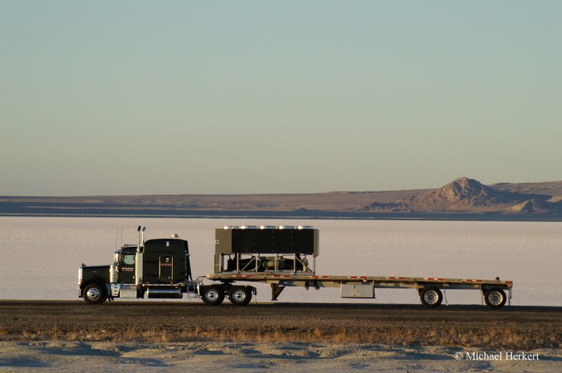 Ein Peterbilt 379 auf dem Interstate Highway 80 zwischen Wendover und Salt Lake City, im Hintergrund der Große Salzsee. Oktober 2006